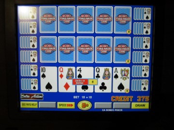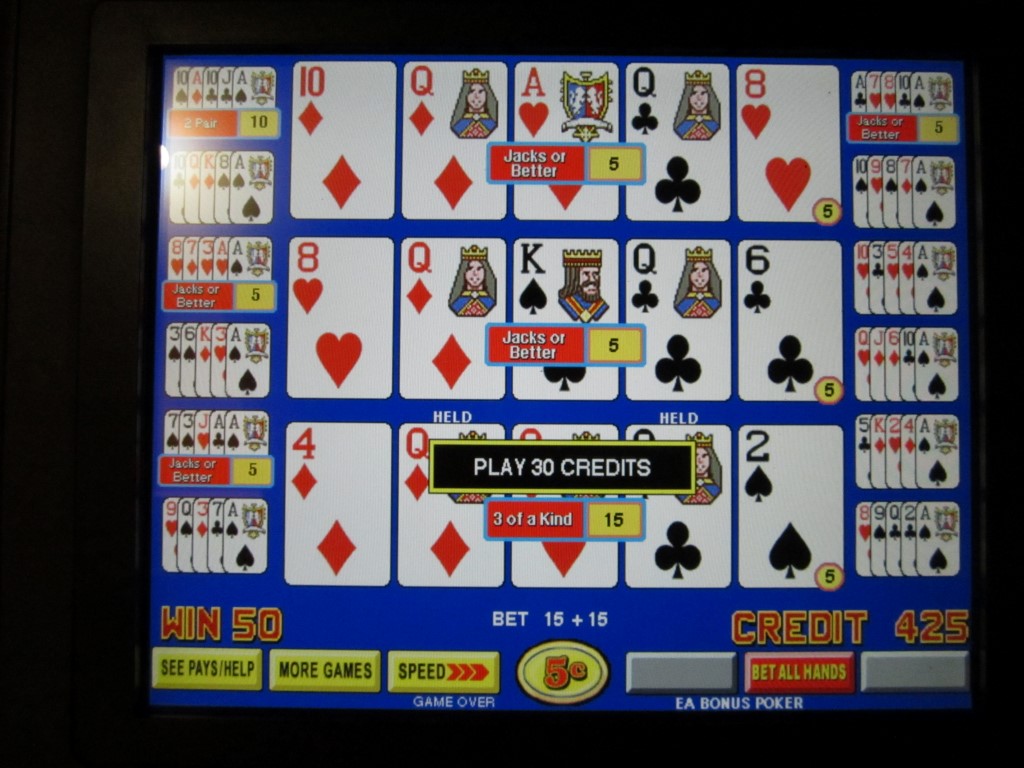 इस उदाहरण में, मैंने 30 क्रेडिट का दांव लगाया। 15 क्रेडिट साधारण ट्रिपल प्ले वीडियो पोकर के तीन हाथों के लिए थे, जिनमें से प्रत्येक में 5 क्रेडिट थे। बाकी 15 क्रेडिट से 12 अतिरिक्त हाथों के लिए एक्स्ट्रा ड्रॉ सुविधा चालू हो गई।