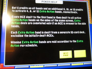 - अगर खिलाड़ी को एक्स्ट्रा एक्शन फ़ीचर चालू होने पर कम से कम एक ऐस (या ड्यूस वाइल्ड गेम्स में ड्यूस) मिलता है, तो उसे अतिरिक्त हैंड मिलेंगे। खास तौर पर, 5 क्रेडिट के अतिरिक्त दांव पर खिलाड़ी को 4 अतिरिक्त हैंड मिलेंगे, 10 क्रेडिट पर 8 अतिरिक्त हैंड मिलेंगे, और 15 क्रेडिट पर 12 अतिरिक्त हैंड मिलेंगे।