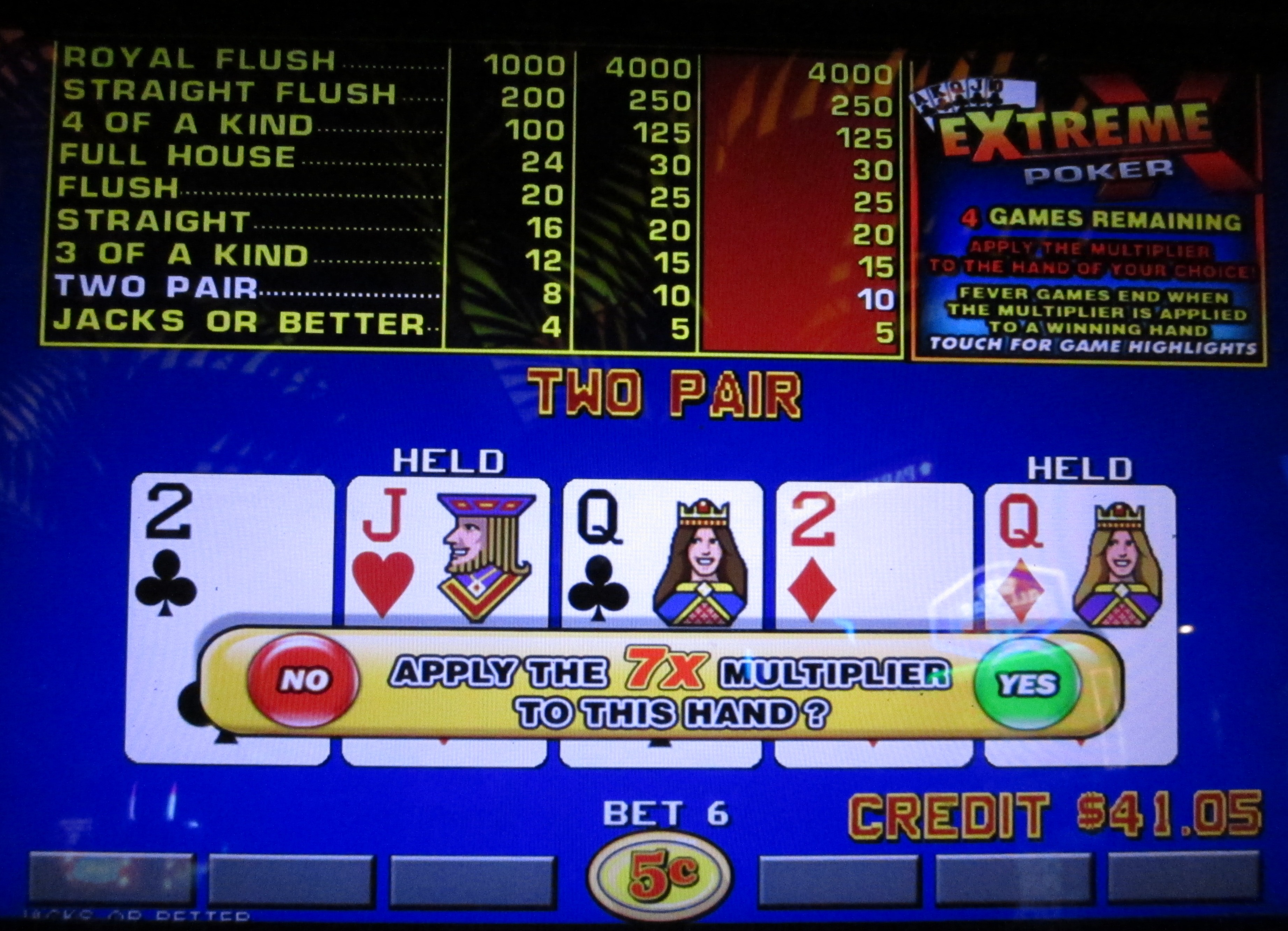 - एक्सट्रीम एक्स पोकर एक से पांच सिक्कों की शर्त के साथ पारंपरिक सिंगल-लाइन वीडियो पोकर की तरह खेला जाता है।