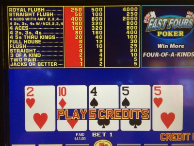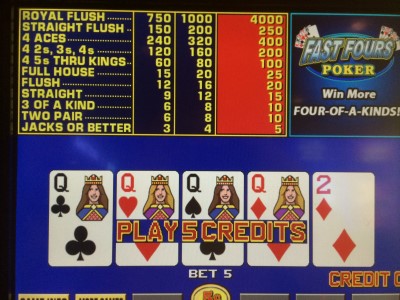 फ़ास्ट फ़ोर्स वीडियो पोकर का एक प्रकार है जिसे मैंने 5 अप्रैल, 2016 को लास वेगास के हार्ड रॉक में देखा था। यह एक पुरानी मशीन पर था, इसलिए मुझे लगता है कि यह खेल काफी समय से चलन में है और किसी तरह पहले मेरी नज़र से बच गया होगा। इस खेल का मुख्य आकर्षण क्विक क्वाड्स जैसा ही है: अगर खिलाड़ी के पास एक तरह का तीन हाथ है जैसे 8-8-8-5-3, और दो सिंगलटन एक तरह के तीन के रैंक के बराबर होते हैं, तो इसे एक तरह का चार के रूप में स्कोर किया जाता है। क्विक क्वाड्स की तरह, इक्के एक अंक के रूप में और 2-10 पिप मूल्य के रूप में गिने जाते हैं। क्विक क्वाड्स के विपरीत, फेस कार्ड भी एक भूमिका निभाते हैं। विशेष रूप से, एक जैक 11 अंकों के रूप में गिना जाता है, एक रानी 12 के रूप में, और एक राजा 13 के रूप में। तो, 2JKKK चार राजाओं के रूप में गिना जाएगा। इसका भुगतान वेतन तालिका को कम करके किया जाता है।