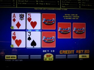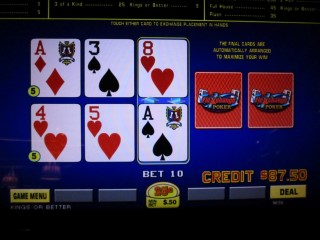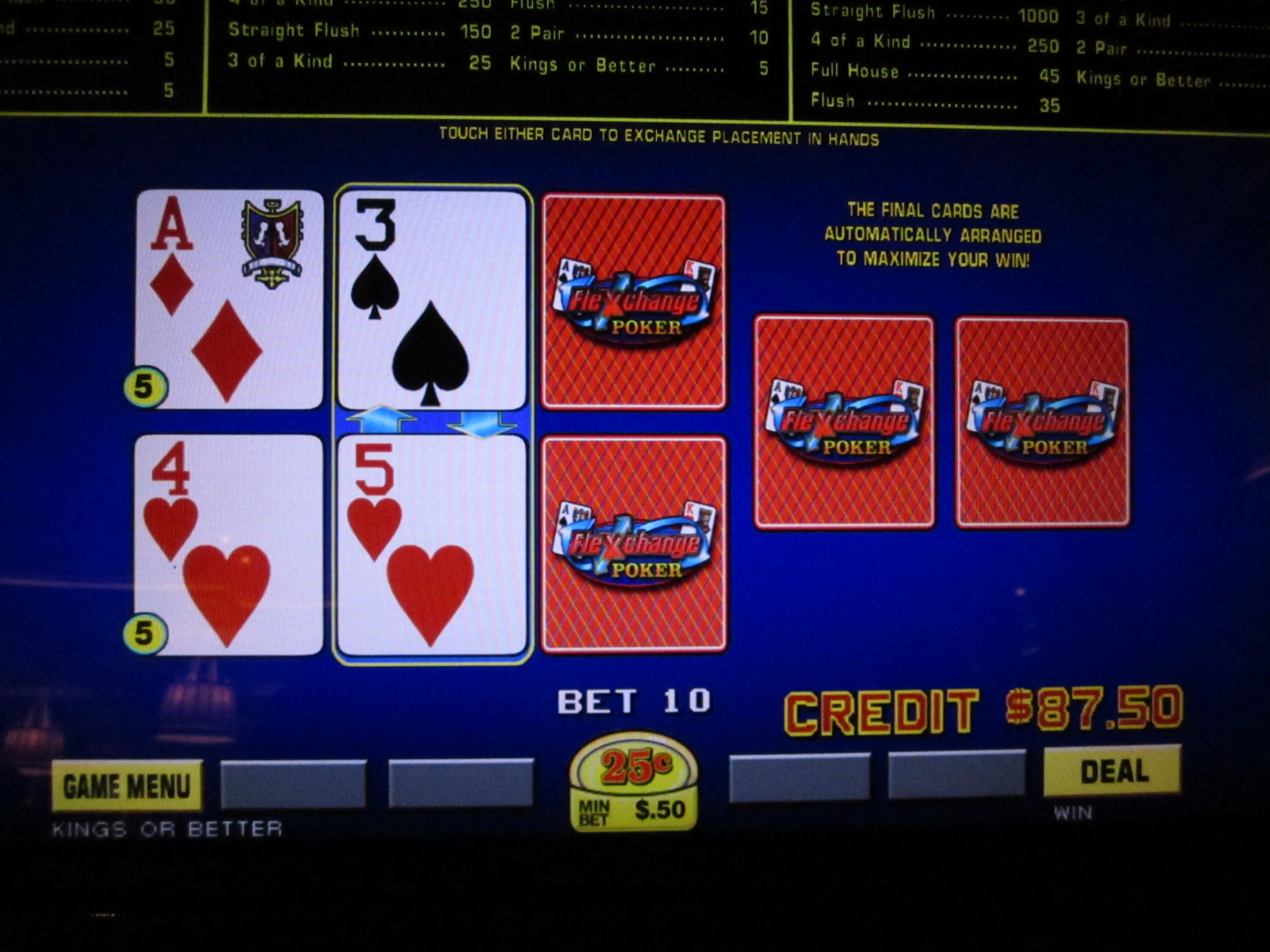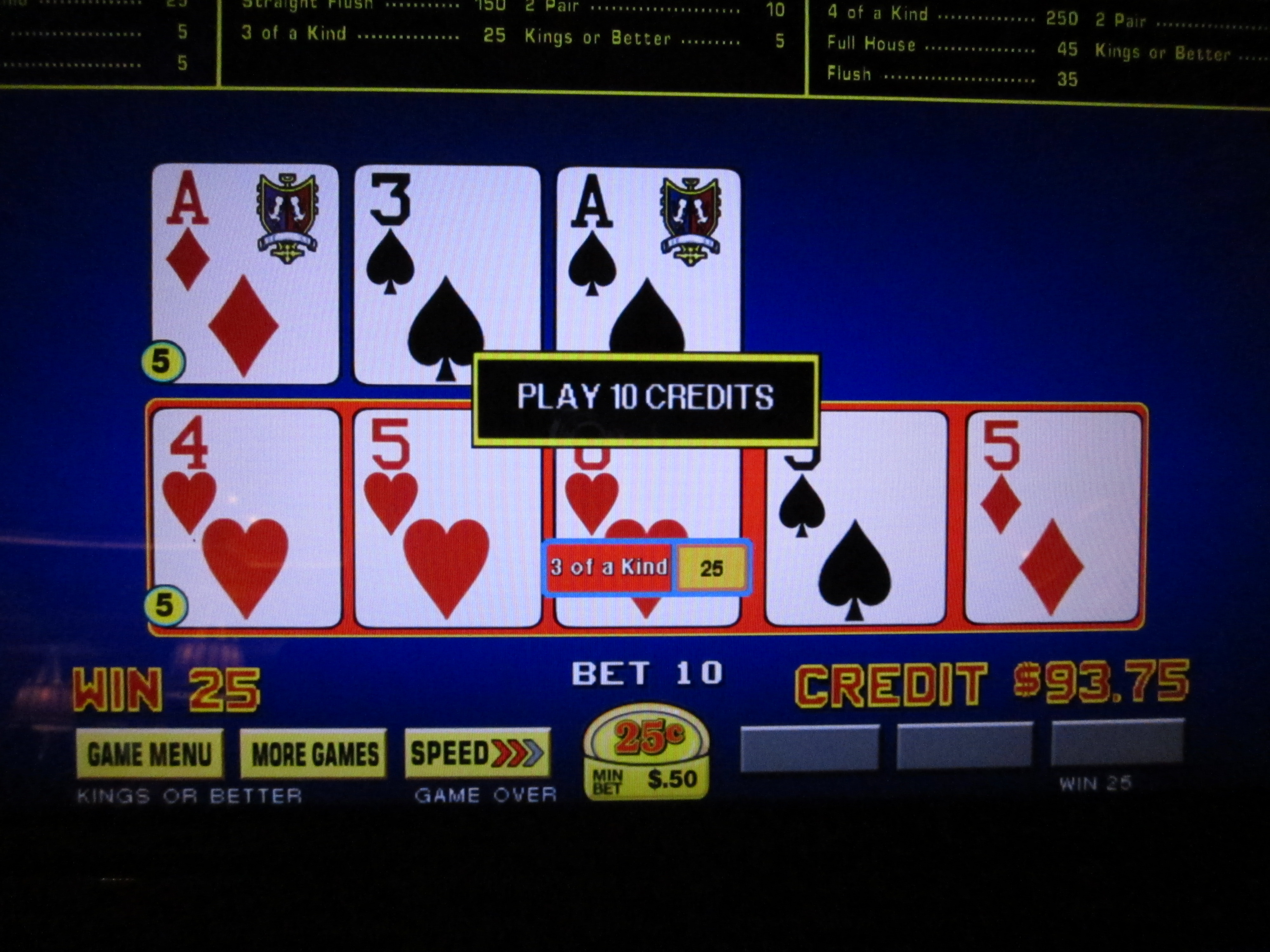 आखिरी दो पत्ते पाँच के थे। खेल में उन्हें सबसे नीचे वाले हाथ में रखा गया जिससे मुझे एक तरह का तीन मिला, जिससे मुझे 25 क्रेडिट मिले।