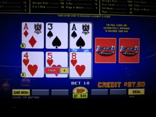 मैंने फिर से स्विच करने का फैसला किया, जिससे मुझे ऊपर वाले हाथ में एक जोड़ी और नीचे वाले हाथ में एक फ्लश मिला। तीन-कार्ड वाले फ्लश पर पाँच क्रेडिट दिए गए।