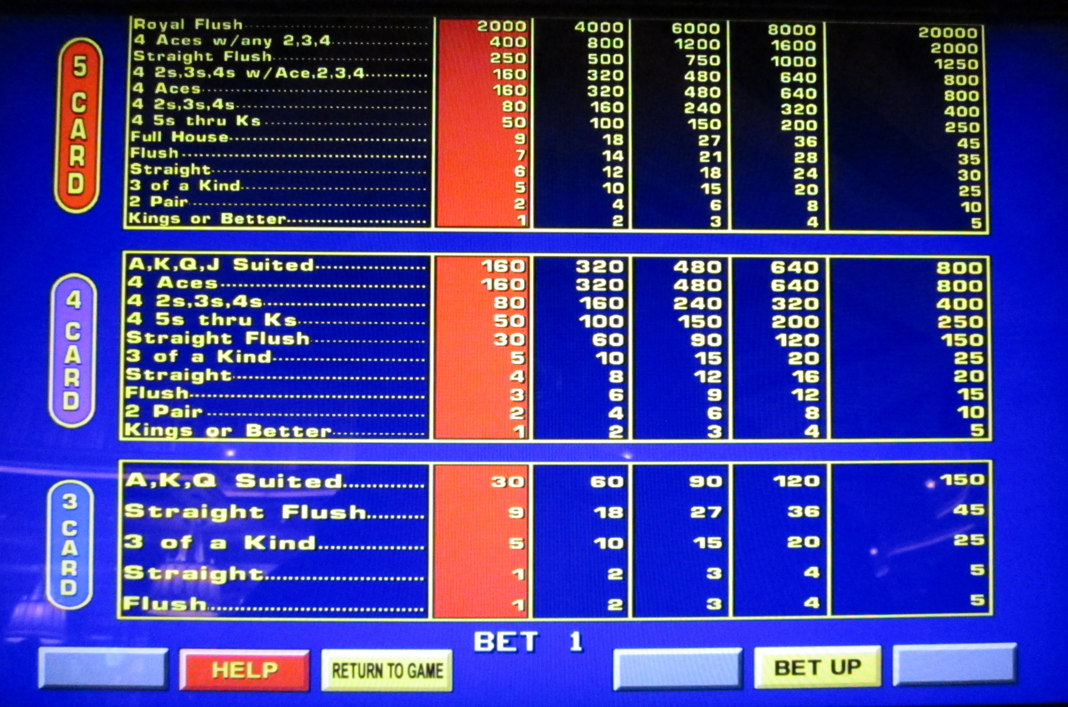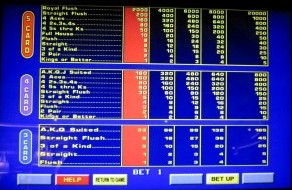 निम्नलिखित तीन तालिकाएँ डबल बोनस, डबल डबल बोनस और किंग्स या बेटर के लिए संभावित भुगतान तालिका दर्शाती हैं। ये स्क्रीनशॉट Wynn लास वेगास से लिए गए थे, जहाँ सभी चार विकल्पों में से तीसरी सबसे ढीली सेटिंग पर सेट थे।