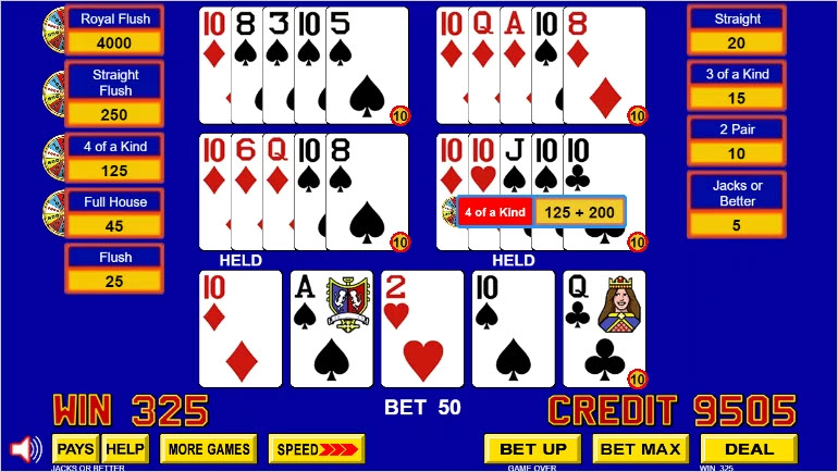 | बोनस पोकर डीलक्स | 7-5 | 96.25% | 294.68 | 97.35% |
