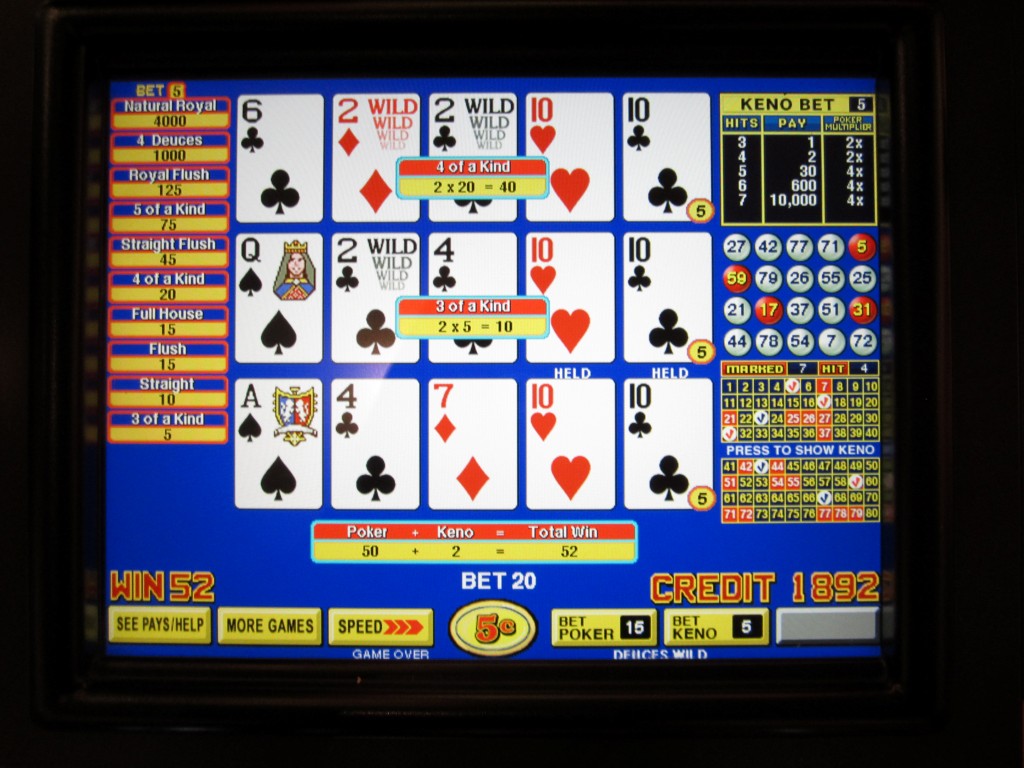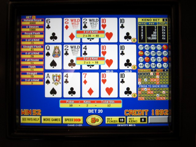 ऊपर दिए गए खेल में, मैंने कुल 20 क्रेडिट दांव पर लगाए: 15 वीडियो पोकर पर और 5 केनो पर। मैंने पहले सात केनो नंबर चुने थे। उनमें से चार हिट हुए, जिससे मुझे तुरंत दो क्रेडिट और 2x वीडियो पोकर गुणक मिला।
