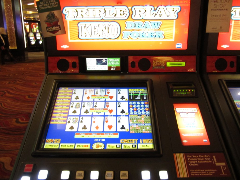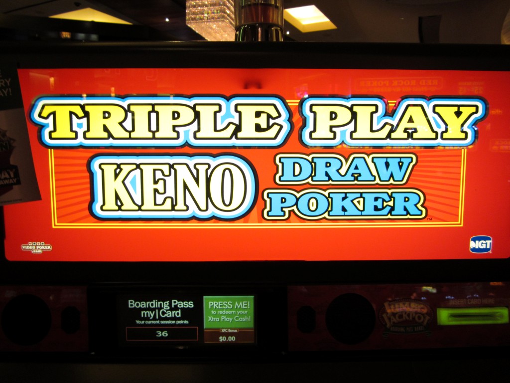 सिर्फ़ वीडियो पोकर के लिए, मैं आमतौर पर 25 क्रेडिट जीतता (चार एक जैसे कार्ड के लिए 20 और तीन एक जैसे कार्ड के लिए 5)। हालाँकि, पोकर गुणक ने इसे दोगुना करके 50 कर दिया। सिर्फ़ केनो में जीत के लिए 2 क्रेडिट जोड़ने पर, मेरा कुल रिटर्न 50+2 = 52 क्रेडिट हुआ।