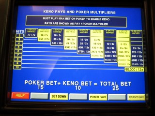 - खिलाड़ी के पास सामान्य वीडियो पोकर खेलने, अतिरिक्त 5-क्रेडिट कीनो दांव लगाने, या अतिरिक्त 10-क्रेडिट कीनो दांव लगाने का विकल्प होता है। अतिरिक्त दांव का विकल्प केवल तभी उपलब्ध होता है जब खिलाड़ी पूरे 15-क्रेडिट वीडियो पोकर दांव (तीनों लाइनों में से प्रत्येक के लिए पाँच क्रेडिट) भी लगाता है।