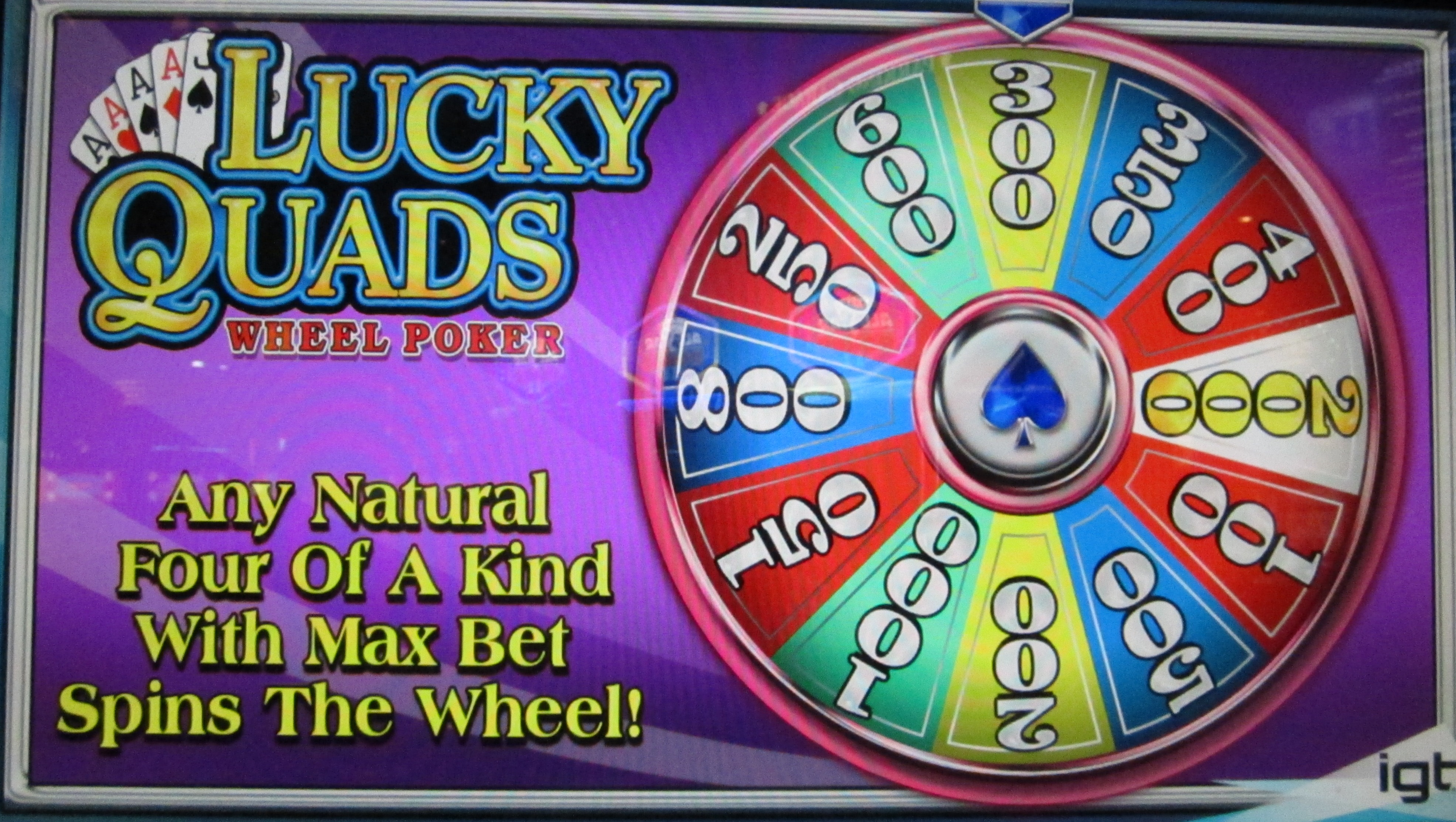 लकी क्वाड्स व्हील पोकर एक सरल वीडियो पोकर संस्करण है जो ड्रॉ में किसी भी प्राकृतिक चार के लिए पुरस्कार चक्र पर एक स्पिन प्रदान करता है। इस सुविधा को सक्षम करने के लिए, खिलाड़ी को अपने मानक पाँच-सिक्के के दांव के अलावा एक सिक्के का शुल्क देना होगा।