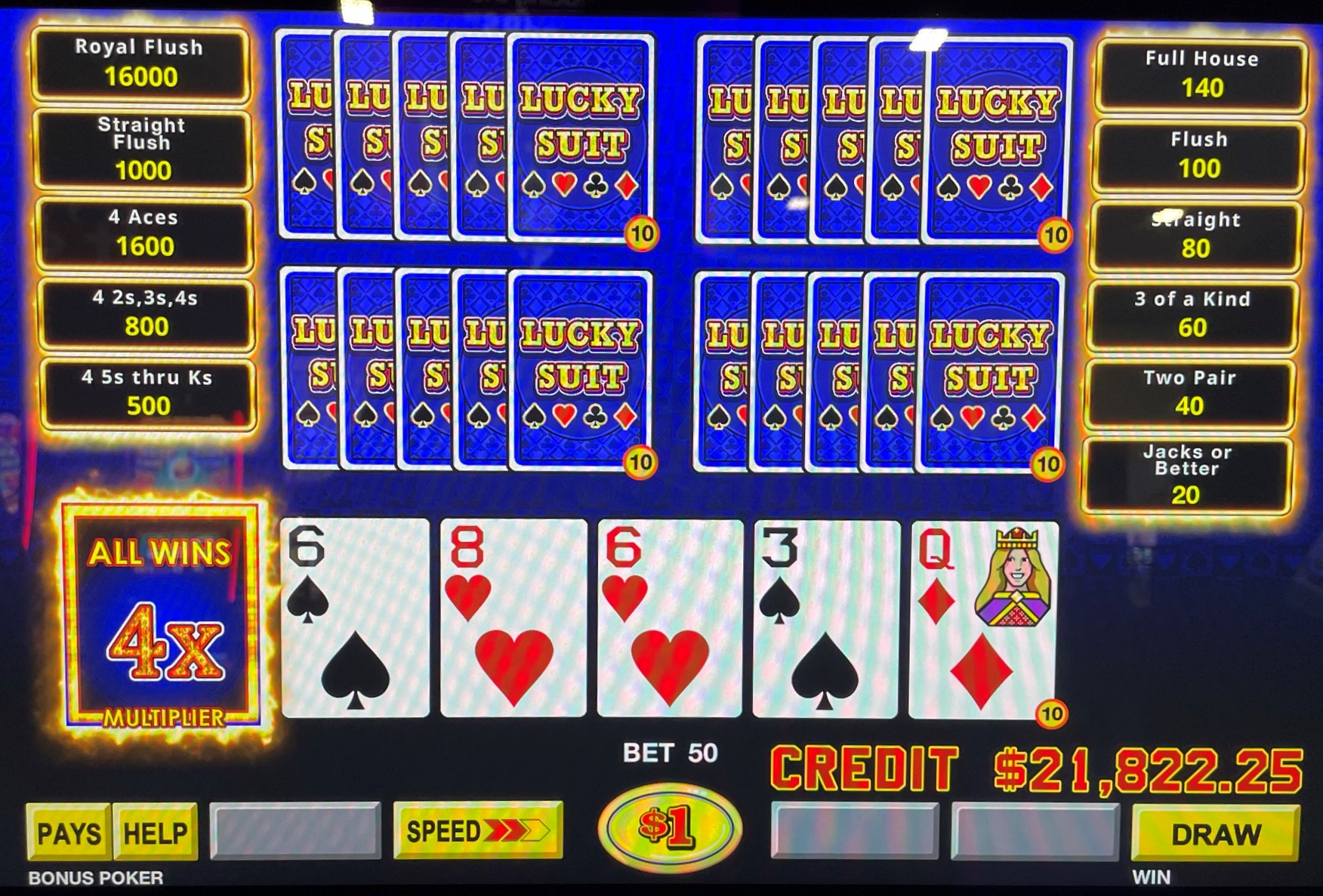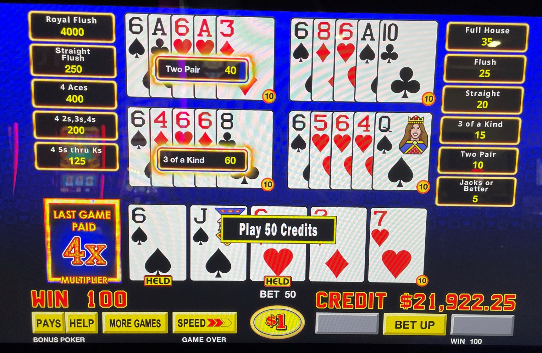 मेरे पास छक्कों का जोड़ा है। ध्यान दें कि गुणक को बनाए रखने के लिए हुकुम का छक्का रखना ज़रूरी नहीं है। एक हाथ दो जोड़े में और दूसरा एक तरह के तीन में बेहतर होता है। आम तौर पर, ये हाथ क्रमशः 10 और 15 क्रेडिट जीतते हैं। हालाँकि, 4x गुणक के साथ, मेरी कुल जीत 4×(10+15) = 100 है।