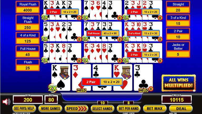 ऊपर दी गई तस्वीर में, डील के तुरंत बाद 2x गुणक दिया गया। ड्रॉ के बाद, मेरे पास चार दो जोड़े, एक तीन एक जैसे, और एक फुल हाउस था। गुणक से पहले, इन सभी हाथों ने क्रमशः 10, 15 और 45 का भुगतान किया था। इस प्रकार, इस हाथ के लिए मेरी कुल जीत 2*(4*10 + 15 + 45) = 200 है।
