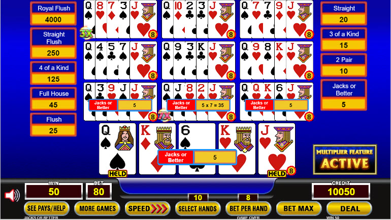 ऊपर दी गई तस्वीर में, ड्रॉ के बाद मुझे दो गुणक मिले। एक ऊपर बाएँ हाथ में 3x था, जो एक हारने वाला हाथ था, इसलिए इससे कोई मदद नहीं मिली। दूसरा ऊपर, बीच वाले कॉलम से तीसरी पंक्ति में 7x गुणक था। यह हाथ जैक या उससे बेहतर था, जिस पर आमतौर पर 5 मिलते हैं। मेरे पास तीन और जैक या उससे बेहतर हाथ भी थे, जिनसे कोई गुणक नहीं मिला। इस प्रकार, मेरी कुल जीत 7*5 + 3*5 = 35 + 15 = 50 क्रेडिट थी।