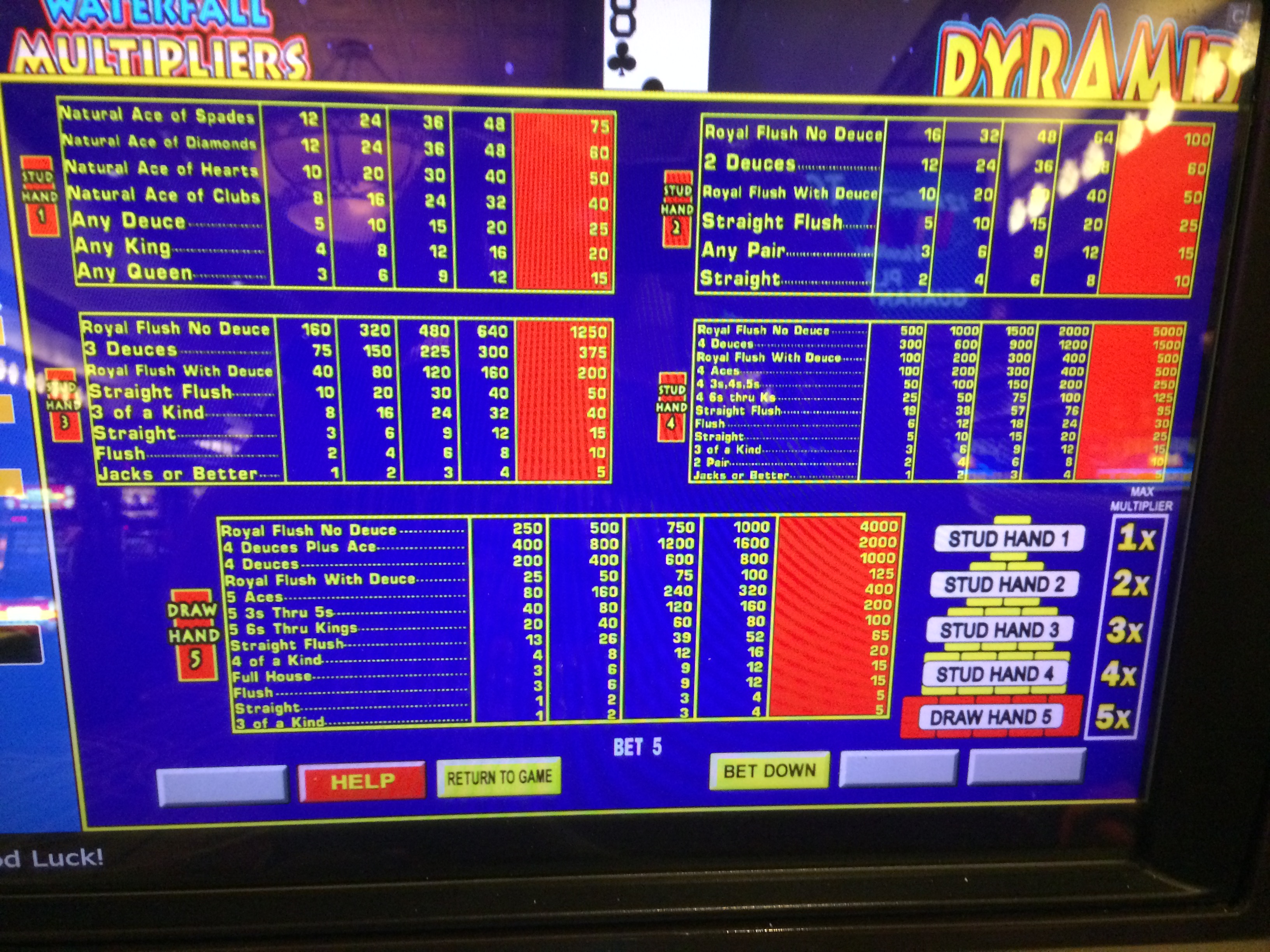 निम्नलिखित भुगतान तालिकाएँ 7-5 बोनस पोकर के लिए, प्रति स्तर अधिकतम 10 सिक्कों के दांव के आधार पर, प्रति दो सिक्कों के दांव पर जीत दर्शाती हैं। कृपया ध्यान दें कि ये तालिकाएँ खेल-दर-खेल अलग-अलग होती हैं।
