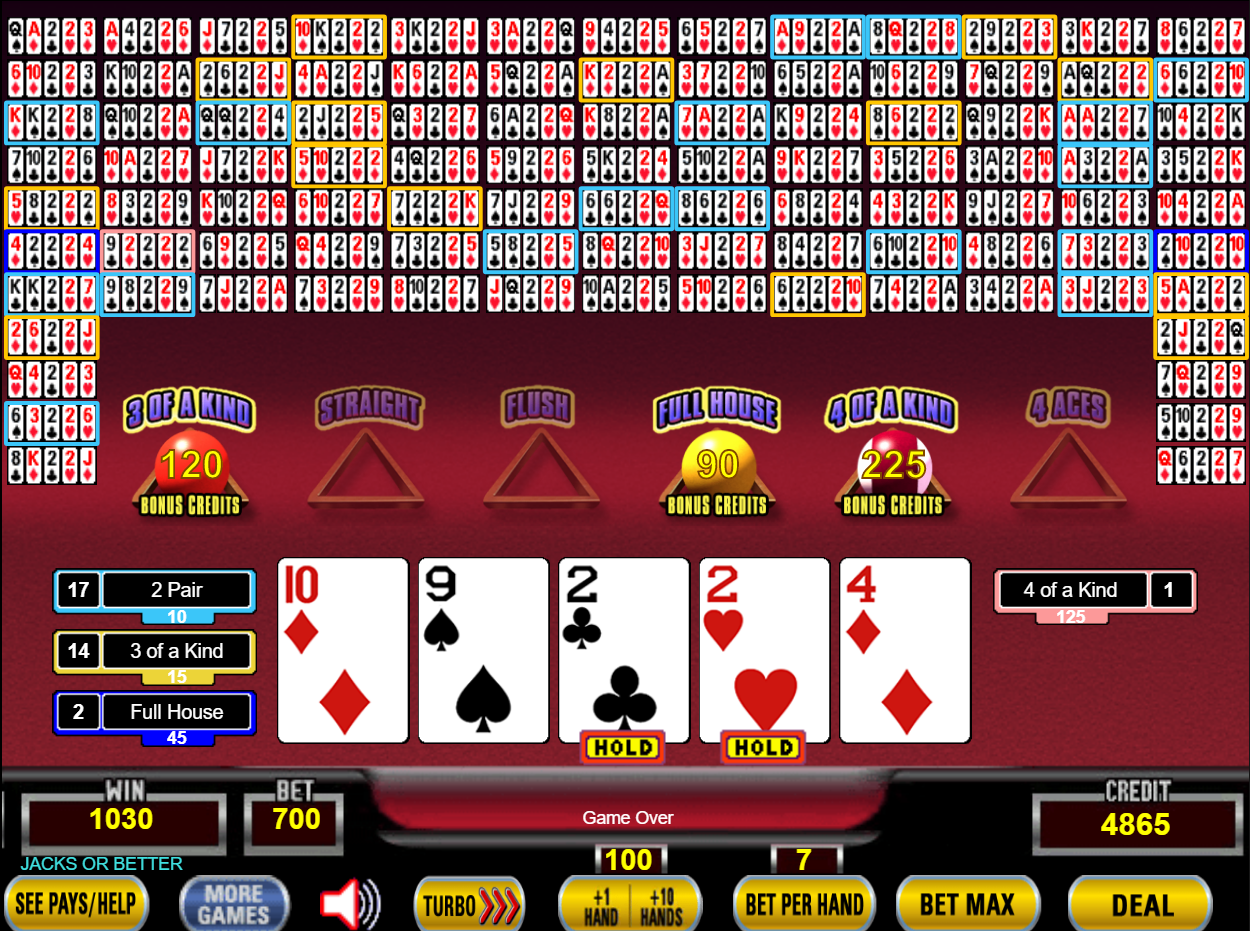 जैसा कि ऊपर 100-प्ले भुगतान तालिका में दिखाया गया है, 14 तीन-एक-तरह के कार्ड का मूल्य 120 है, 2 फुल हाउस का मूल्य 90 है, और एक चार-एक-तरह के कार्ड का मूल्य 225 है। इस प्रकार, बोनस जीत 120+90+225 = 435 है। प्रत्येक हाथ के लिए व्यक्तिगत जीत का मूल्य 5×(17×2 + 14×3 + 2×9 + 1×25) = 595 है। इस प्रकार कुल जीत 595+435 = 1030 है, जैसा कि विन बॉक्स में भी दिखाया गया है।