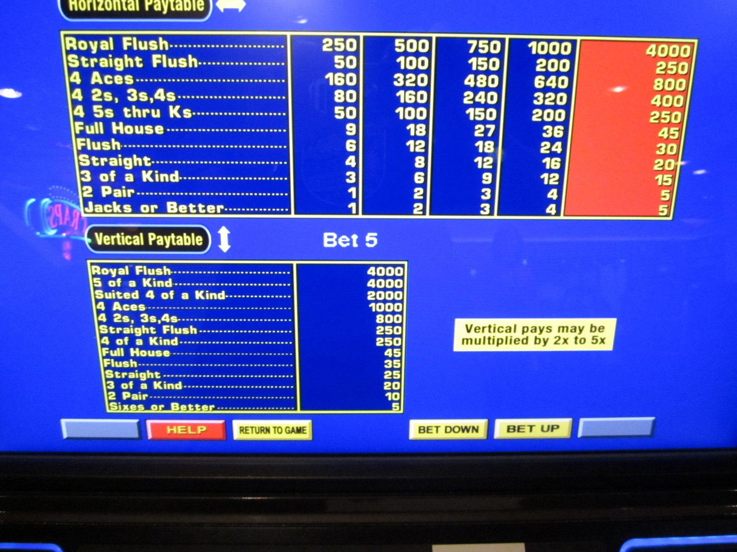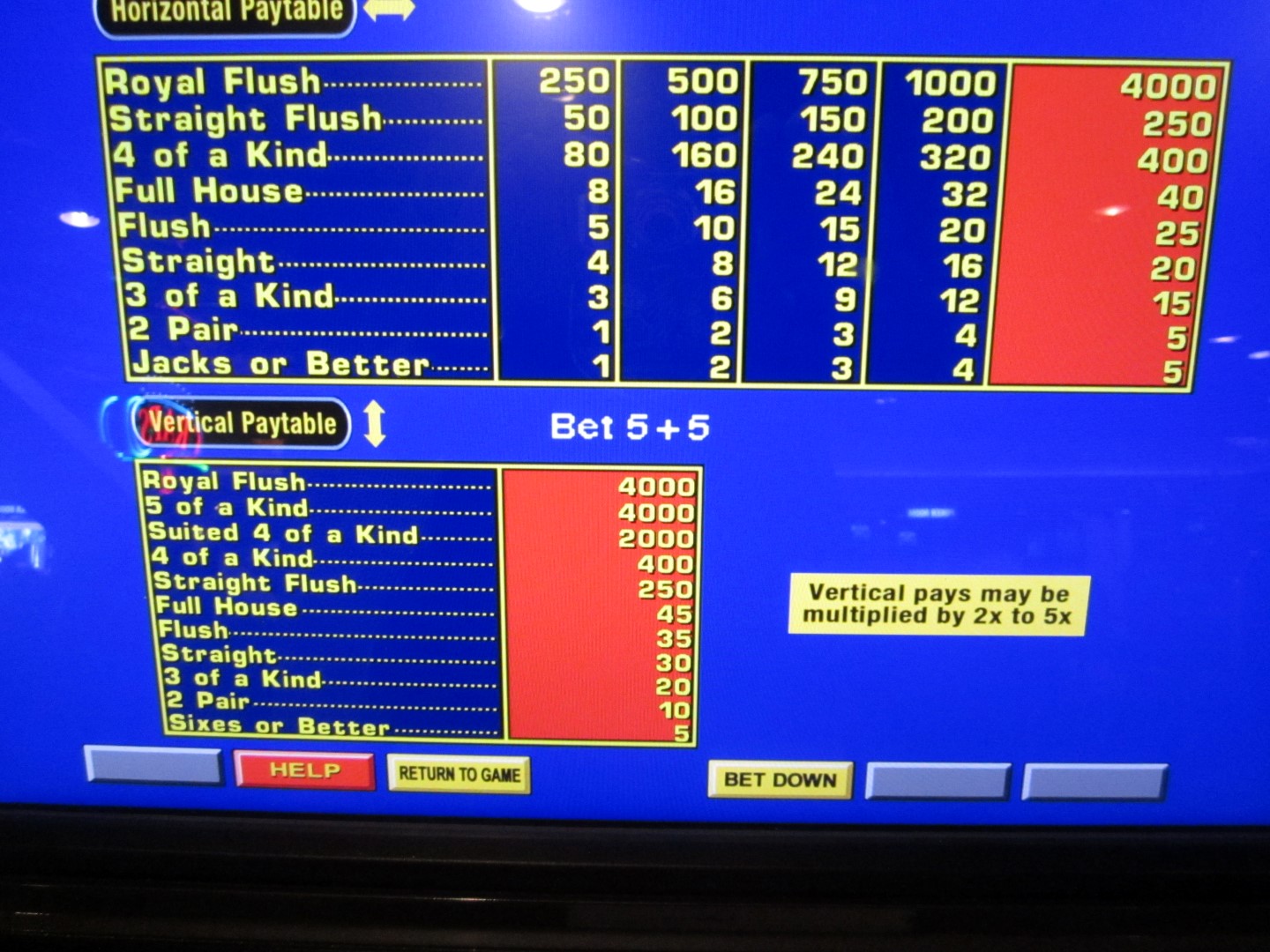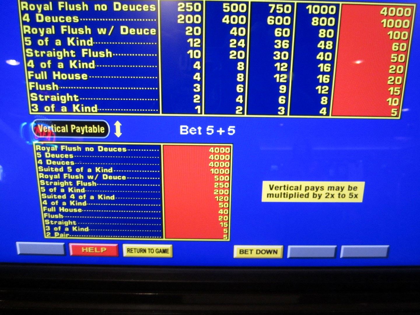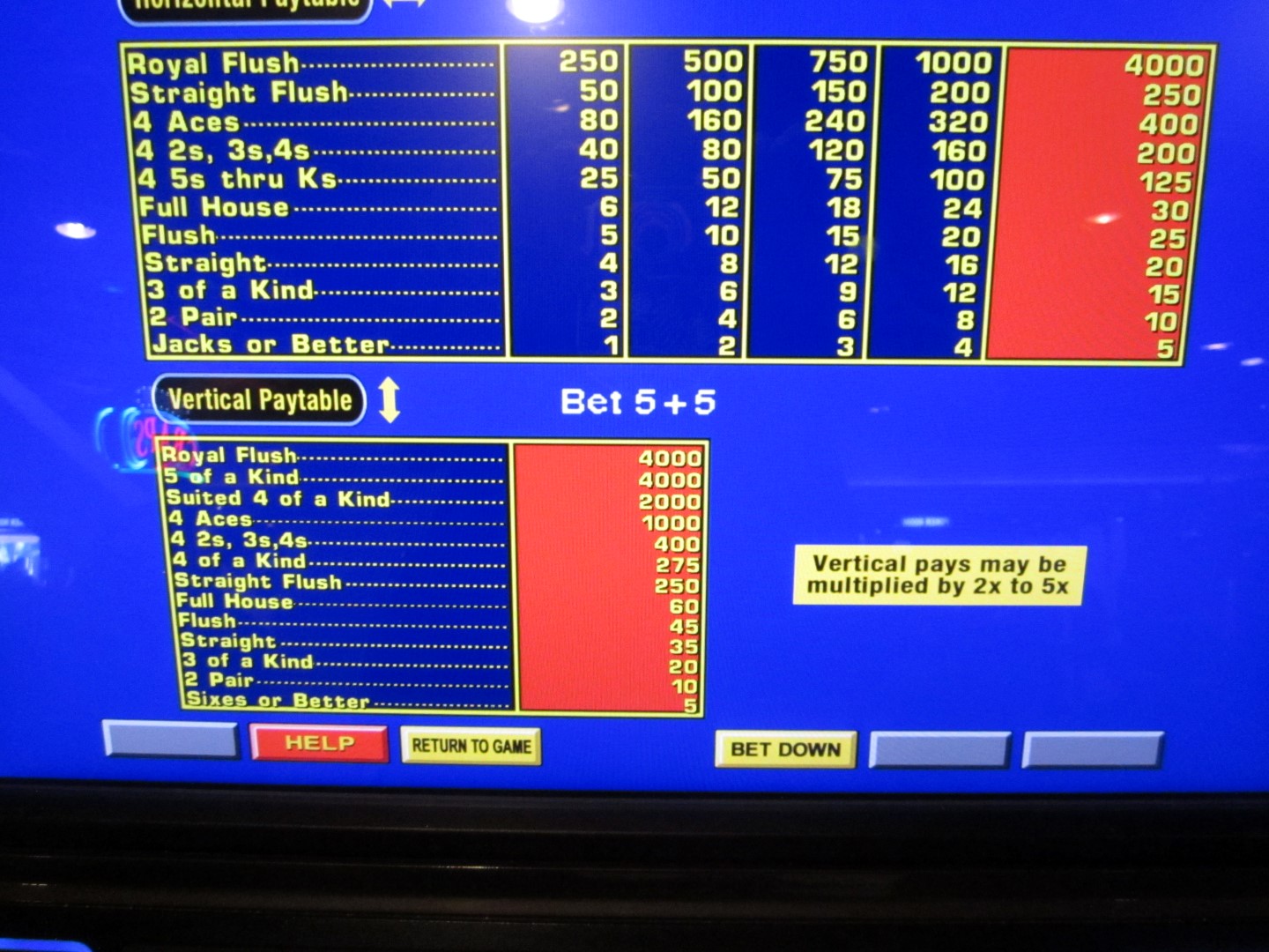 - खिलाड़ी मूल हाथ में त्यागे गए पत्तों की संख्या के अनुसार, ऊर्ध्वाधर हाथों पर गुणकों के लिए भी अर्हता प्राप्त करेगा। यदि शून्य या पाँच पत्ते रखे गए हैं, तो कोई गुणक उपलब्ध नहीं होगा। संभावित और औसत गुणकों का विवरण निम्नलिखित तालिका में दिया गया है। "औसत गुणक" कॉलम, गुणक की संभावना और ऐसे गुणकों के औसत को ध्यान में रखते हुए, जीत पर लागू होने वाले औसत गुणक को दर्शाता है।