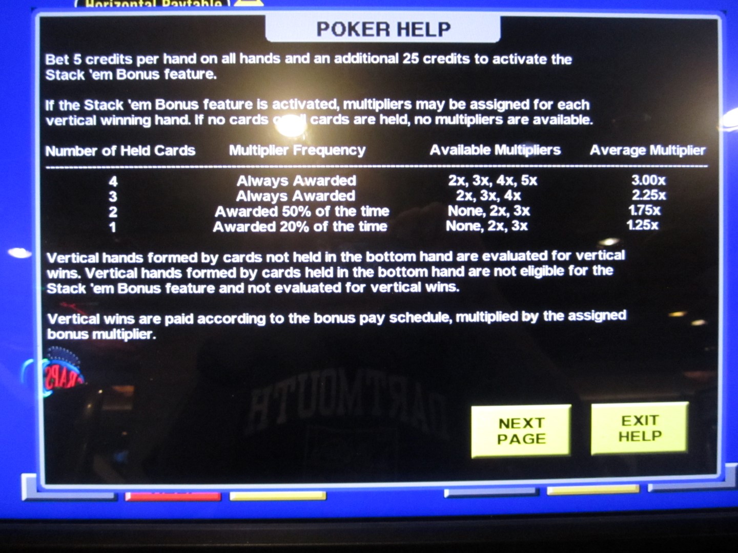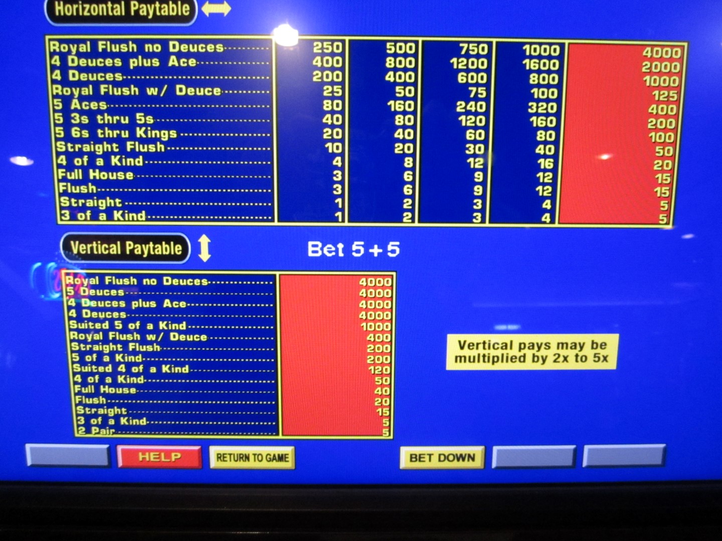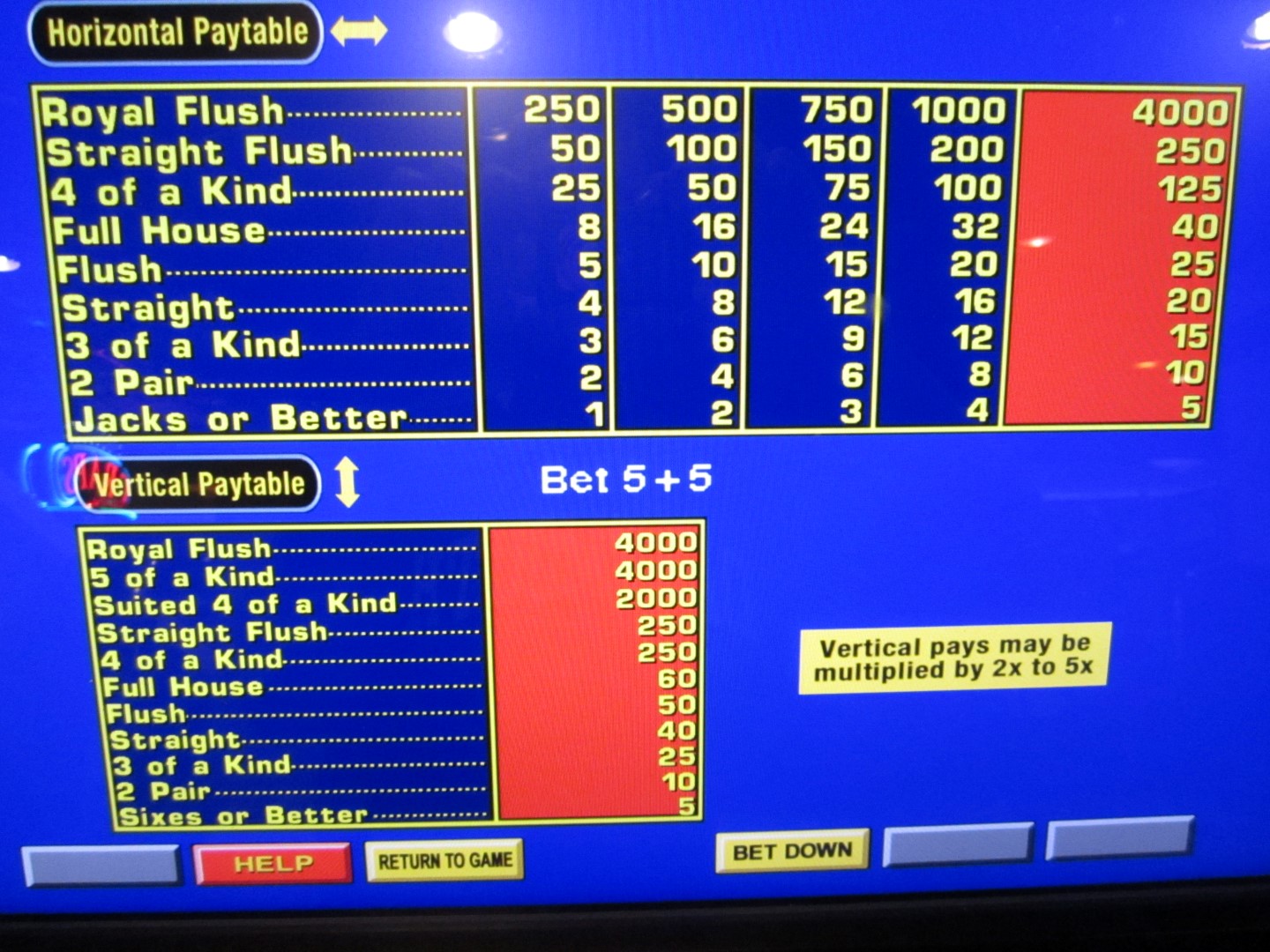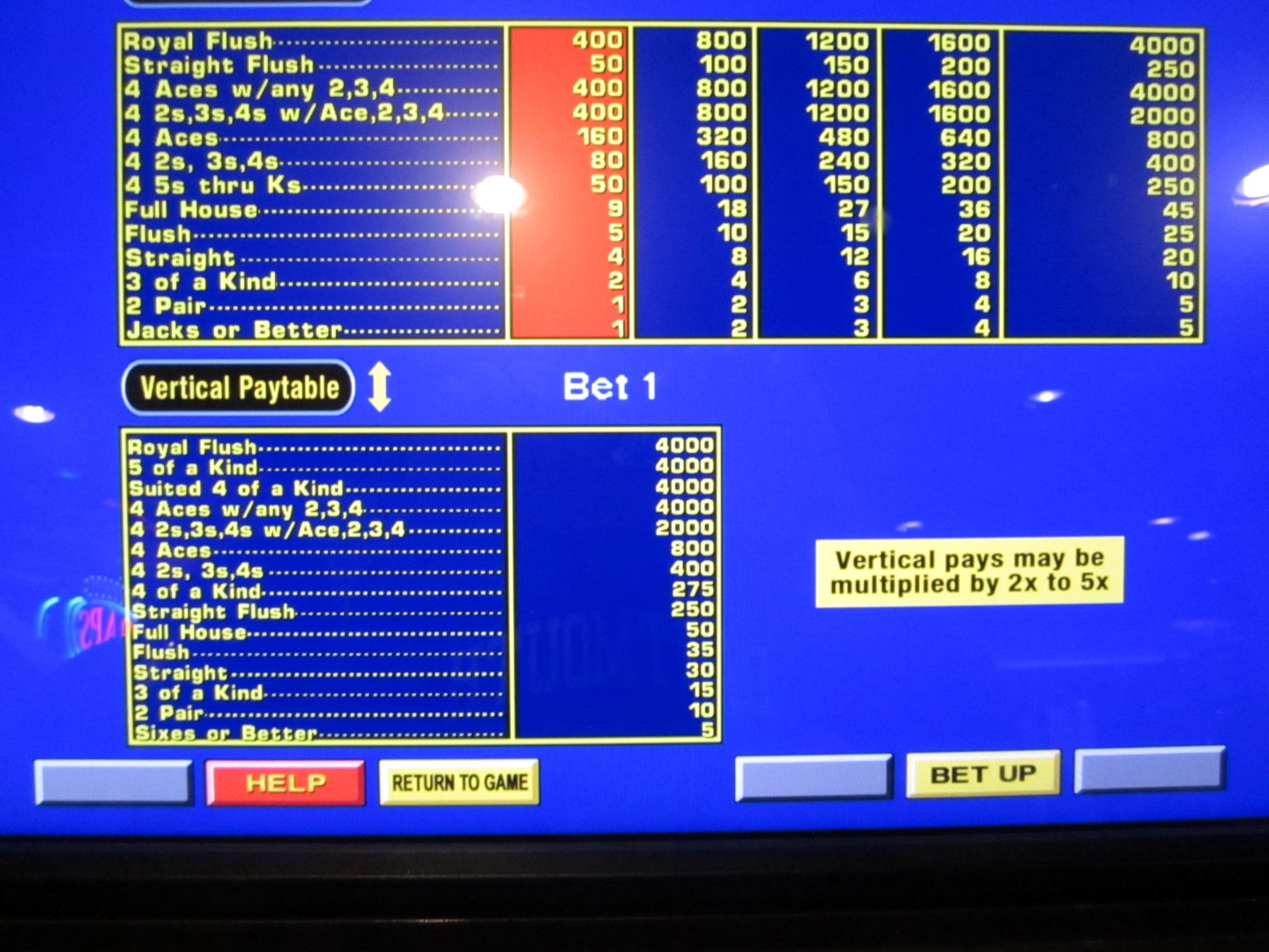 - खिलाड़ी मूल हाथ में त्यागे गए पत्तों की संख्या के अनुसार, ऊर्ध्वाधर हाथों पर गुणकों के लिए भी अर्हता प्राप्त करेगा। यदि शून्य या पाँच पत्ते रखे गए हैं, तो कोई गुणक उपलब्ध नहीं होगा। संभावित और औसत गुणकों का विवरण निम्नलिखित तालिका में दिया गया है। "औसत गुणक" कॉलम, गुणक की संभावना और ऐसे गुणकों के औसत को ध्यान में रखते हुए, जीत पर लागू होने वाले औसत गुणक को दर्शाता है।