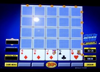 मैं अधिकतम 50 क्रेडिट का दांव लगाता हूँ, सभी दस पंक्तियों (पाँच ऊर्ध्वाधर और पाँच क्षैतिज) के लिए पाँच क्रेडिट के लिए। आप नीचे वाली पंक्ति में सौदे पर मेरा हाथ देख सकते हैं।