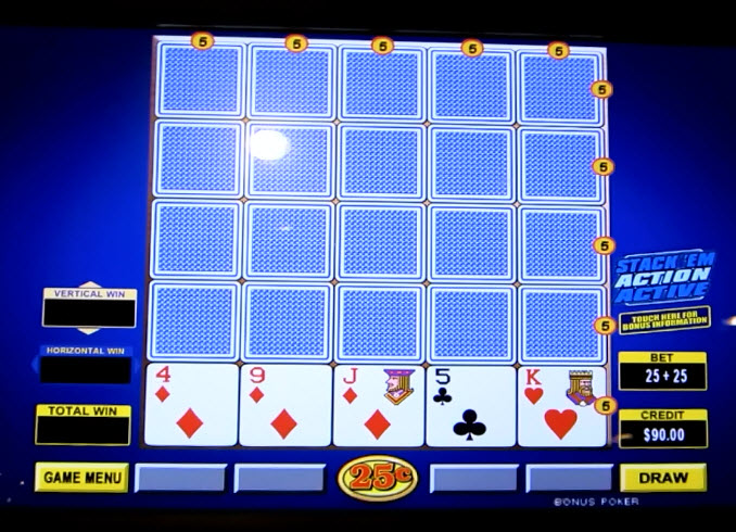 - स्टैक 'एम पोकर को पारंपरिक पाँच-प्ले वीडियो पोकर की तरह खेला जा सकता है। इस गेम में पाँच क्षैतिज हाथ होते हैं, जो पाँच गुणा पाँच कार्डों के मैट्रिक्स में होते हैं।