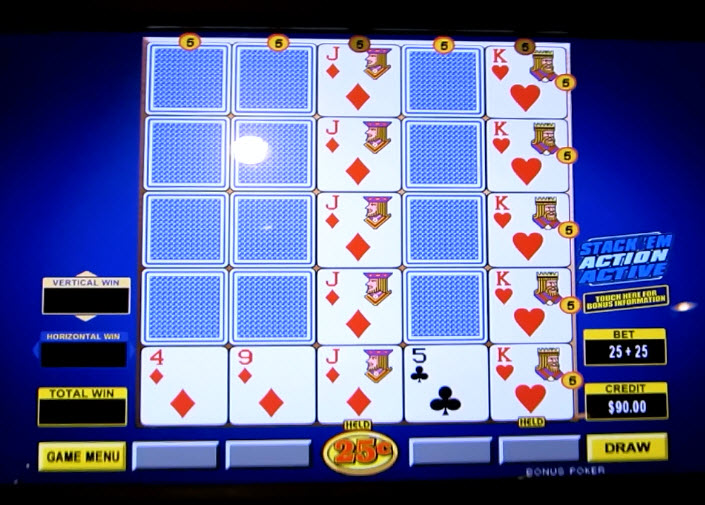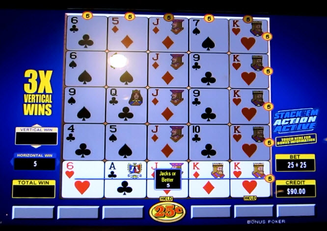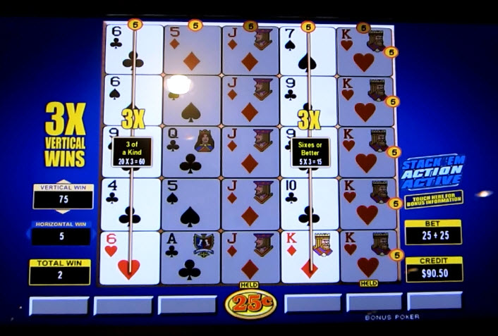 बाईं ओर से चौथे हाथ में मेरे पास छक्कों का एक जोड़ा या उससे बेहतर था, जिससे प्रति पंक्ति दांव का 1x भुगतान होता है। प्रति हाथ पाँच क्रेडिट दांव और 3x गुणक के आधार पर, उस हाथ की जीत 5×1×3=15 है।
