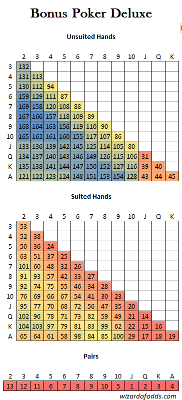 बोनस पोकर डीलक्स गेम के लिए निम्नलिखित रणनीति उपयुक्त होगी, जिसमें निम्नलिखित भुगतान तालिकाएँ होंगी। जीत की राशि प्रति सिक्के के हिसाब से, प्रति हाथ पाँच सिक्कों के दांव के आधार पर व्यक्त की जाती है।