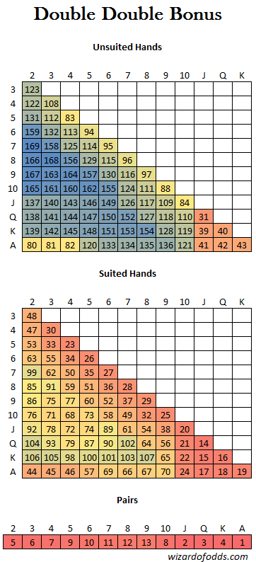 निम्नलिखित रणनीति डबल डबल बोनस गेम के लिए उपयुक्त होगी, जिसमें निम्नलिखित भुगतान तालिकाएँ होंगी। जीत की राशि प्रति सिक्के के हिसाब से, प्रति हाथ पाँच सिक्कों के दांव के आधार पर व्यक्त की जाती है।