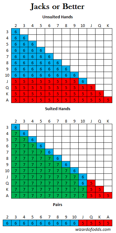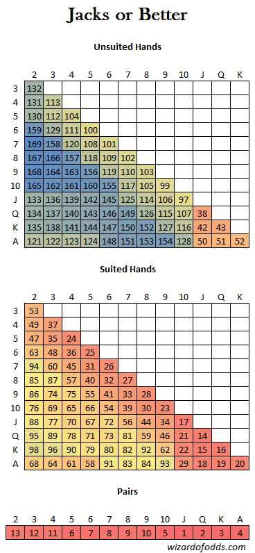 निम्नलिखित रणनीति जैक्स या बेटर गेम के लिए उपयुक्त होगी, जिसमें निम्नलिखित भुगतान तालिकाएँ होंगी। जीत की राशि प्रति सिक्के के हिसाब से, प्रति हाथ पाँच सिक्कों के दांव के आधार पर व्यक्त की जाती है।