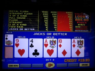 यह चौथी भुगतान तालिका लास वेगास के रैम्पर्ट कैसीनो में $1 की मशीन पर खेले जाने वाले बोनस पोकर गेम के लिए है। नीचे दाएँ सेल में 96.98% का रिटर्न दिखाया गया है। इसे एक से पाँच सिक्कों की शर्त के लिए मानक "6-5" भुगतान तालिका के साथ जोड़ा गया है, जो 96.87% रिटर्न देती है। इसलिए, कम से कम इस गेम के लिए, अधिकतम आठ सिक्कों की शर्त लगाने पर रिटर्न 0.11% ज़्यादा है।