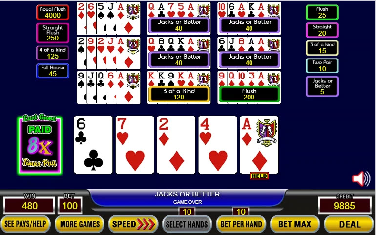 ऊपर दी गई तस्वीर में, मैंने 8x गुणक पर जीत हासिल की। ड्रॉ के बाद, मेरे पास चार हाई पेयर, एक थ्री ऑफ़ अ काइंड और एक फ्लश था। आम तौर पर, इसका भुगतान 4*5 + 15 + 25 = 60 होता। हालाँकि, 8x गुणक के साथ, मेरी जीत 8*60 = 480 थी।