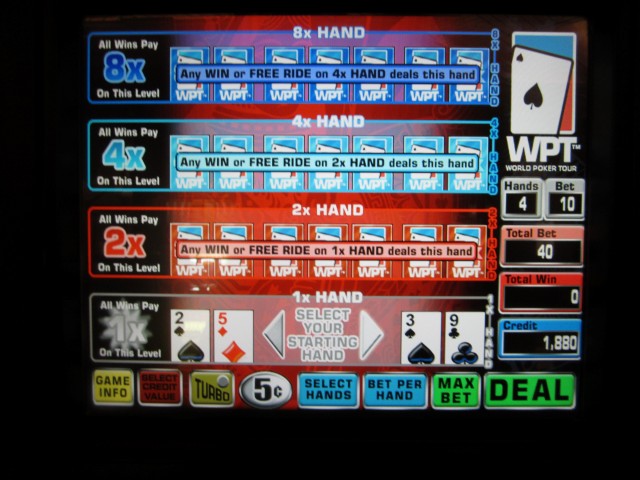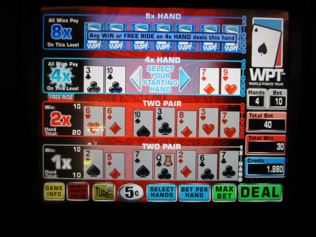 मुझे लेवल दो पर दो जोड़ी मिली, जिससे दो जोड़ी के लिए 1X और लेवल दो के लिए 2X मिलता है। तो, मेरे 10 सिक्कों वाले दांव ने प्रति हाथ 10 × 1 × 2 × = 20 सिक्के जीते, यानी अब तक कुल 30 सिक्के। मैं लेवल तीन तक भी पहुँच गया। वहाँ शुरुआती हाथ के लिए मेरे पास 3-10 सूट वाले या 7-9 ऑफ-सूट वाले विकल्प थे। मुझे नहीं पता कि मैंने गणितीय रूप से सबसे अच्छा विकल्प चुना या नहीं, लेकिन मैंने 3-10 सूट वाले विकल्प को चुना।