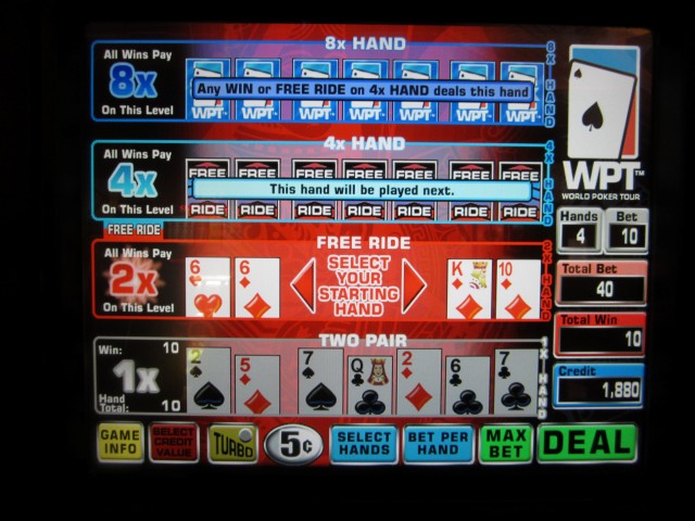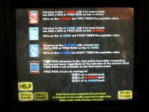 मुझे लेवल एक पर दो जोड़ी मिली और मैंने हर हाथ पर 10 सिक्कों की अपनी शर्त का 1 गुना जीत लिया। मैं लेवल दो पर भी पहुँच गया। तस्वीर लेने से पहले, मुझे एक फ्री राइड कार्ड दिया गया। इसका प्रमाण यह है कि तीसरे हाथ के पत्तों के पीछे फ्री राइड लिखा है, और तीसरे हाथ के सामने लिखा है, "यह हाथ अगला खेला जाएगा।" शुरुआती हाथ के लिए मेरे विकल्प छक्कों का जोड़ा या किंग-टेन सूट थे। मैंने छक्कों का जोड़ा चुना।