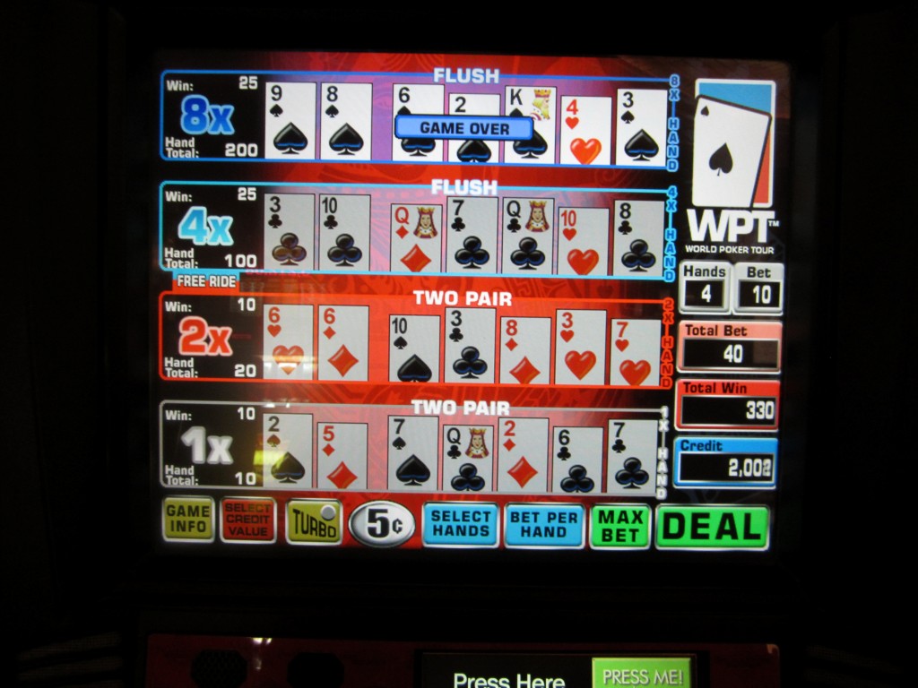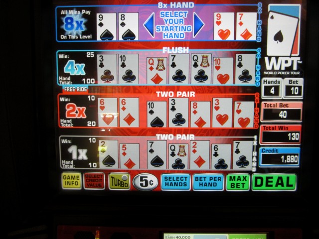 मुझे चौथे स्तर पर फ्लश मिला, जो फ्लश के लिए 2.5x और चौथे स्तर के लिए 8x का भुगतान करता है, उस हाथ पर कुल जीत 10 × 2.5 × 8 = 200 सिक्के, 330 सिक्कों की अंतिम जीत के लिए।