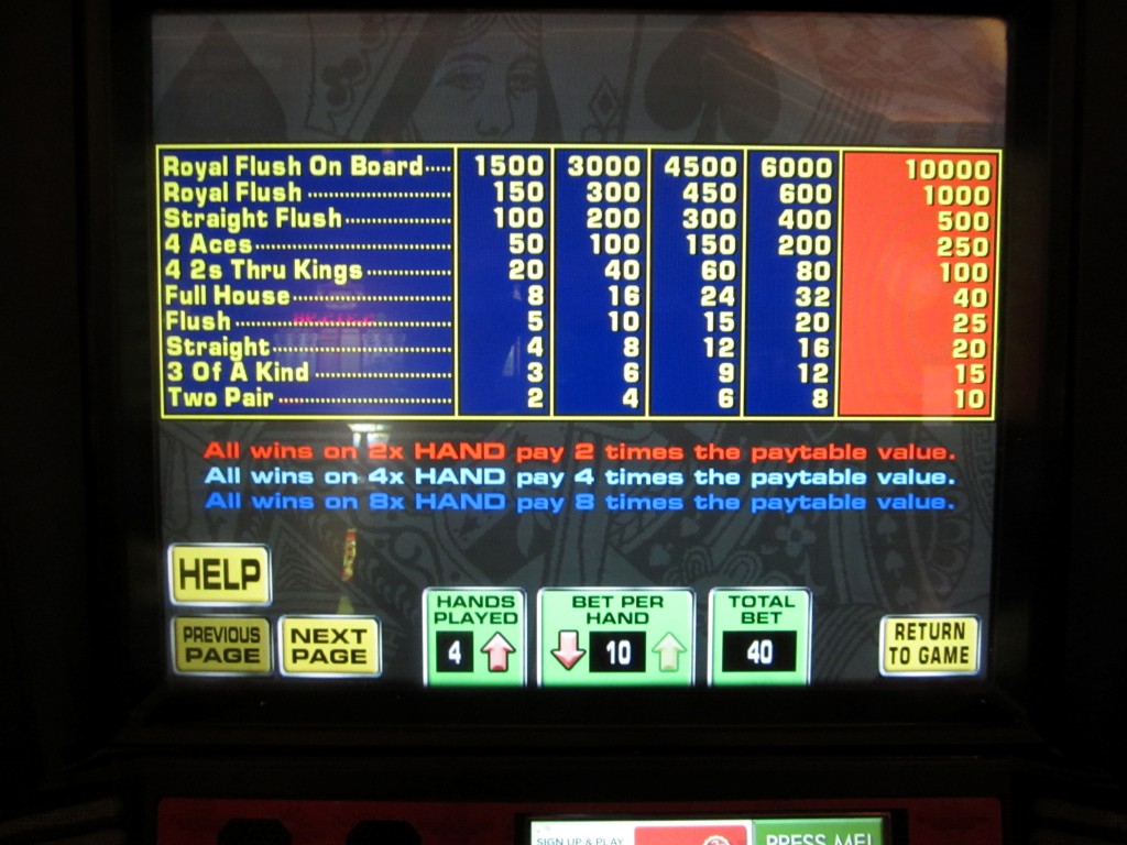 वेतन तालिकारॉयल फ्लश ऑन बोर्ड 1000 1000 1000 1000 1000 रॉयल फ़्लश 100 100 100 100 100 स्ट्रेट फ्लश 50 50 50 50 50 चार इक्के 25 25 25 25 25 चार 2-के 10 10 10 10 10 पूरा घर 5 4.5 4 4 4 लालिमा 3 3 3 3 2.5 सीधा 2.5 2.5 2.5 2 2 तीन हास्य अभिनेता 1.5 1.5 1.5 1.5 1.5 दो जोड़ी 1 1 1 1 1 - यदि खिलाड़ी ने कम से कम दो हाथों के लिए भुगतान किया है, तो उसके पास स्तर 2 तक आगे बढ़ने के दो तरीके हैं।