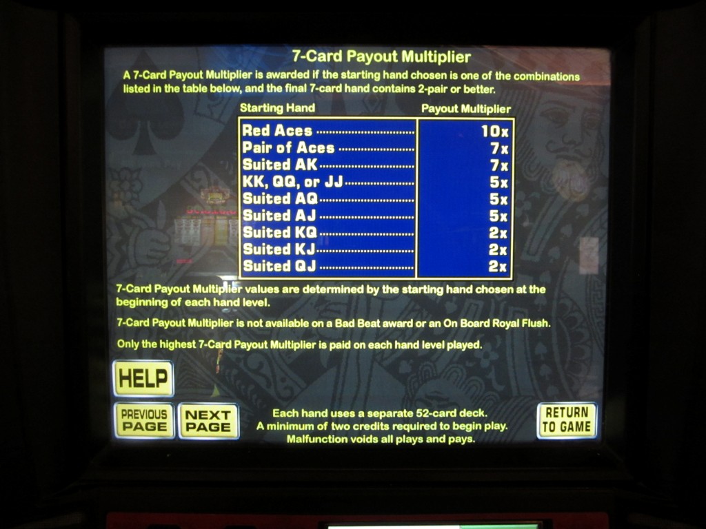 - खिलाड़ी को सात पत्तों के बीच सबसे अच्छे पाँच पत्तों वाले पोकर हाथ के अनुसार भुगतान किया जाएगा। गेम मेकर की ओर से निम्नलिखित पाँच भुगतान तालिकाएँ उपलब्ध हैं। यह तालिका प्रति हाथ प्रति सिक्के की बाजी पर जीत दर्शाती है, जो प्रति पंक्ति अधिकतम दस सिक्कों की बाजी पर आधारित है। प्रत्येक भुगतान तालिका की पहचान फुल हाउस, फ्लश और स्ट्रेट द्वारा क्रमशः 2 सिक्कों प्रति हाथ की बाजी पर दिए जाने वाले भुगतान से होती है। शीर्ष दो पुरस्कार प्रति हाथ दस सिक्कों से कम की बाजी पर अनुपातहीन रूप से कम भुगतान करते हैं, जो खिलाड़ी को कभी नहीं करना चाहिए।