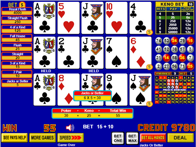 जैक की जोड़ी के साथ केवल निचला हाथ ही जीतता है। उच्च जोड़ी के लिए आधार जीत 5 क्रेडिट है। 6x गुणक के साथ, मेरी वीडियो पोकर जीत 6×5 = 30 है। इस प्रकार मेरी कुल जीत केनो के लिए 25 + वीडियो पोकर के लिए 30 = 55 क्रेडिट थी।