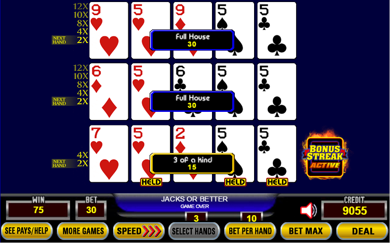 ध्यान दें कि गेम 2 में प्रत्येक हाथ का गुणक 2X है, जैसा कि प्रत्येक हाथ के बाईं ओर गुणक रेखा में बड़े फ़ॉन्ट में दिखाया गया है। मुझे डील में चार से फ्लश मिले थे। दुर्भाग्य से, उनमें से कोई भी विकसित नहीं हुआ, इसलिए मेरी जीत शून्य रही और तीन 2X गुणक बेकार गए।