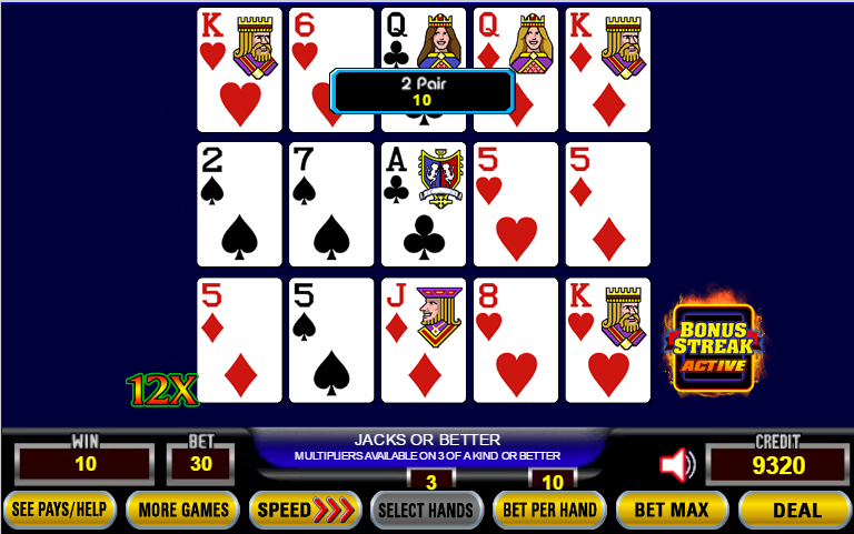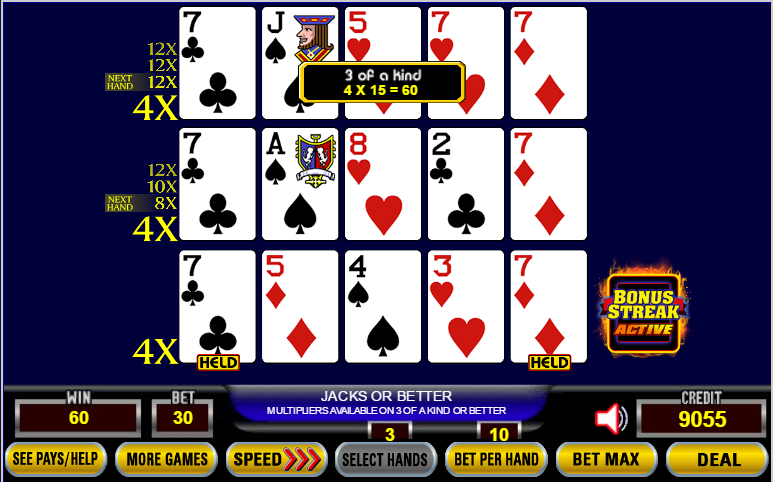जैक्स ऑर बेटर में, एक फुल हाउस अगले पाँच हाथों में 2-4-8-10-12 की बोनस स्ट्रीक अर्जित करता है। थ्री ऑफ़ अ काइंड अगले दो हाथों में 2-4 की बोनस स्ट्रीक अर्जित करता है।