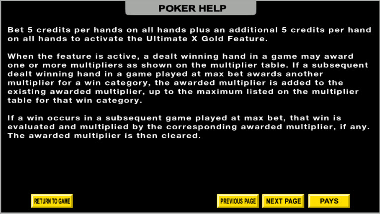 अल्टीमेट एक्स गोल्ड, एक्शन गेमिंग द्वारा निर्मित एक वीडियो पोकर संस्करण है। यह मल्टी-प्ले वीडियो पोकर पर आधारित है, खासकर 3-प्ले, 5-प्ले या 10-प्ले पर। अगर खिलाड़ी हर हाथ में पाँच सिक्के अतिरिक्त लगाता है, जो सामान्य पाँच सिक्कों की अधिकतम शर्त से ज़्यादा है, तो यह एक गुणक सुविधा को सक्रिय कर देगा। पारंपरिक अल्टीमेट एक्स के विपरीत, गुणक सभी हाथों पर लागू होते हैं, लेकिन केवल विशिष्ट जीत पर, और उपयोग किए जाने तक बने रहते हैं।