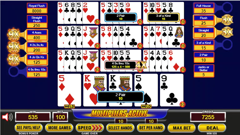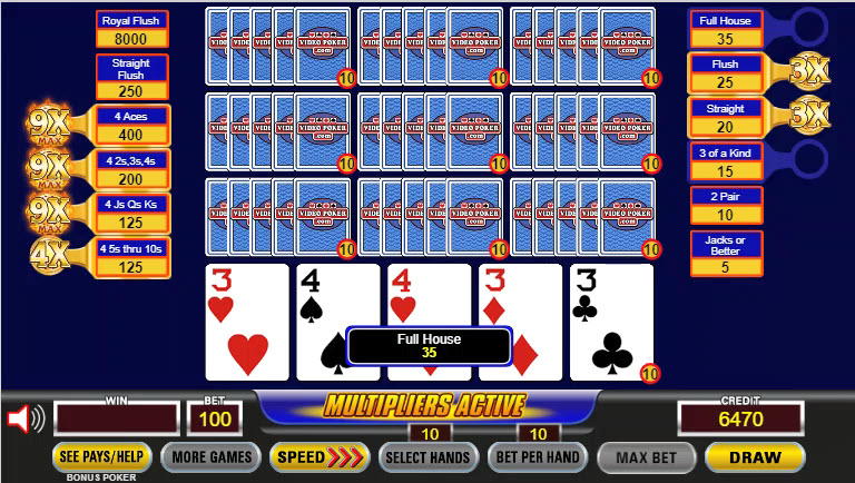 - ड्यूस वाइल्ड को छोड़कर सभी खेलों में, एक तरह के तीन से लेकर एक तरह के चार तक के हाथों में से प्रत्येक के साथ एक गुणक जुड़ा होगा। ड्यूस वाइल्ड में, गुणक फ्लश से लेकर चार ड्यूस तक के हाथों से जुड़े होंगे।