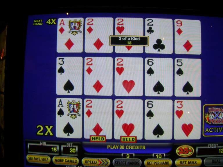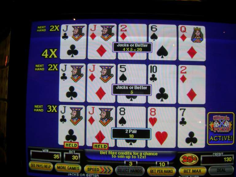 अगला स्क्रीनशॉट अगले हाथ को दिखाता है। ऊपर वाले हाथ में मुझे जैक्स का एक जोड़ा मिला। आमतौर पर इससे 5 सिक्के मिलते, लेकिन 4 गुना गुणक इसे बढ़ाकर 20 सिक्के कर देता है। बीच वाले और नीचे वाले हाथ तो नहीं बढ़े, लेकिन अगले हाथ के लिए मुझे गुणक ज़रूर मिले (ऊपर वाले और बीच वाले हाथ के लिए 2 गुना, और नीचे वाले हाथ के लिए 3 गुना), क्योंकि मैंने अधिकतम 30 सिक्के दांव पर लगाए थे।