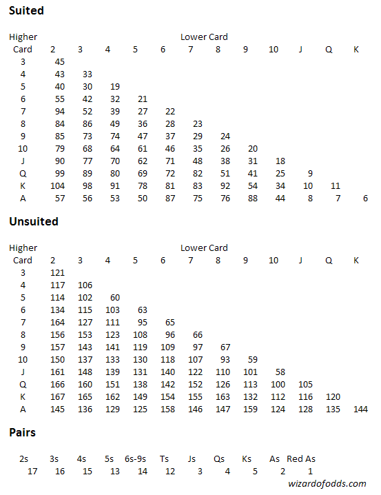 निम्नलिखित तालिका सुपर वीडियो होल्ड 'एम की भुगतान तालिका 6 के अंतर्गत, सभी प्रकार के 2-कार्ड वाले हाथों की रैंकिंग दर्शाती है। शुरुआती 2-कार्ड वाले हाथों के किसी भी जोड़े के लिए, प्रत्येक की पावर रेटिंग देखें। फिर, उच्च रेटिंग (या कम संख्या) वाले हाथ को खेलें। याद रखें, त्यागे गए हाथ के पत्ते वापस डेक में डाल दिए जाते हैं, इसलिए चिंता करने लायक कोई पेनल्टी कार्ड अपवाद नहीं हैं। अपेक्षित मूल्य वाला कॉलम उस हाथ की औसत जीत दर्शाता है। प्रायिकता वाला कॉलम उन संभावनाओं को दर्शाता है कि आप उस हाथ को जीतेंगे और खेलेंगे। रिटर्न वाला कॉलम प्रायिकता और अपेक्षित रिटर्न का गुणनफल है। रिटर्न का योग पूरे खेल का रिटर्न होता है, जो 98.14% होता है।