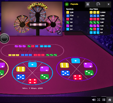 व्हील ऑफ़ डाइस एक साधारण सा भाग्य का खेल है जिसे मैंने एक इंटरनेट कैसीनो में देखा, जहाँ इवोल्यूशन गेमिंग सॉफ्टवेयर का इस्तेमाल होता था। इस खेल में तीन पहिये होते हैं जिनमें से प्रत्येक पर 32 स्टॉप होते हैं। प्रत्येक स्टॉप एक पासे का एक फलक दिखाता है, एक से छह तक। जितने कम बिंदु होंगे, पहियों पर उतने ही अधिक बिंदु दिखाई देंगे। खिलाड़ी चुन सकता है कि किस पहिये पर दांव लगाना है और वह किस फलक पर गिरेगा। तीनों पहियों पर आधारित एक अतिरिक्त दांव भी होता है।