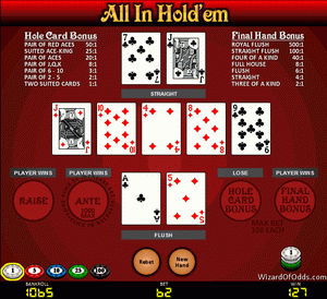 - "प्लेयर होल कार्ड्स बोनस बेट" का भुगतान खिलाड़ी के दो होल्ड कार्ड्स के मूल्य के अनुसार किया जाता है। भुगतान तालिका नीचे दी गई है।