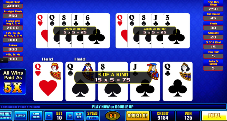 - यदि खिलाड़ी प्रति खेल 1 से 5 क्रेडिट का दांव लगाता है, तो खेल पारंपरिक वीडियो पोकर की तरह खेला जाएगा।