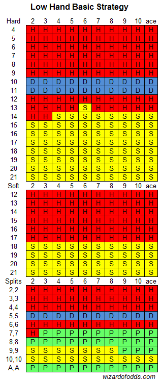 निम्न तालिका निम्न हाथ के लिए बुनियादी रणनीति दर्शाती है।