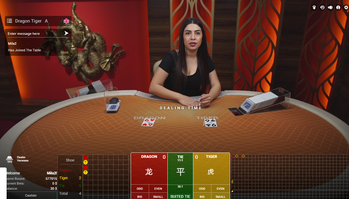 एशिया लाइव टेक ड्रैगन टाइगर को एक असली गेमिंग टेबल पर उपलब्ध कराता है। मुझे लगता है कि यह कहीं ज़मीनी कसीनो में है, टेबल के ऊपर लगे कैमरे से अंदाज़ा लगाया जा सकता है। टेबल पर कम से कम तीन भाषाओं का मिश्रण दिखाई देता है, लेकिन ऐसा लगता है कि वे दांवों की पूरी रेंज उपलब्ध कराते हैं। वे टाई होने पर पूरे 11 से 1 ऑड्स भी देते हैं।