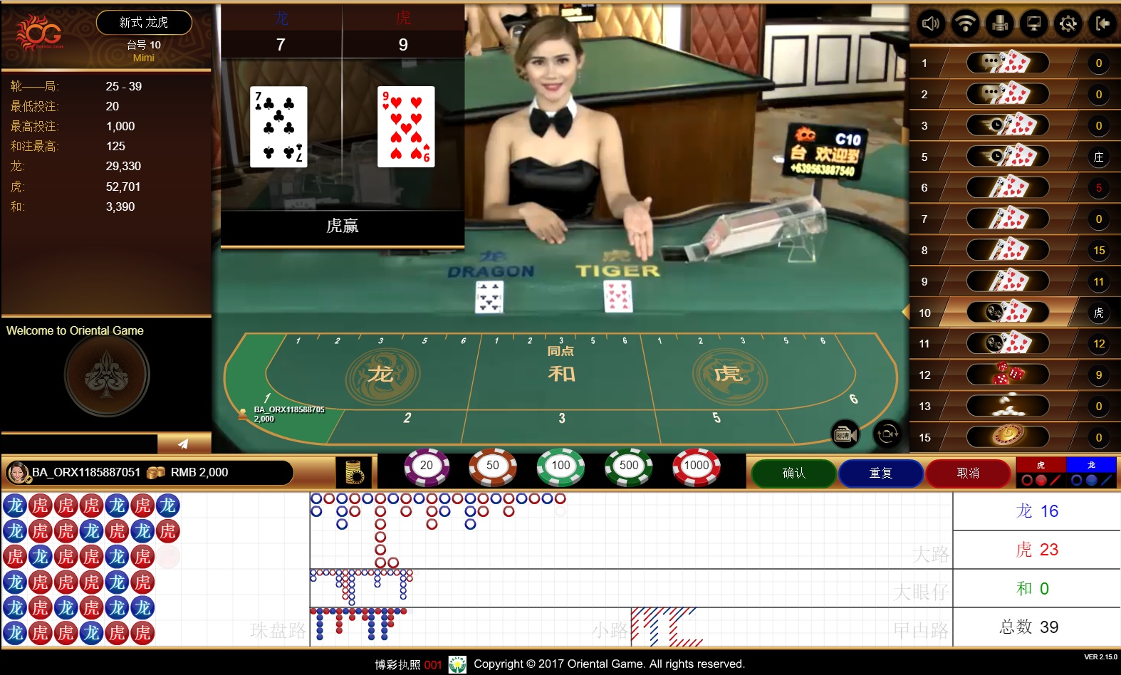 ओरिएंटल गेम ड्रैगन टाइगर का एक साधारण खेल है जिसमें सिर्फ़ तीन मुख्य दांव होते हैं। इस स्टूडियो की मेरी पसंदीदा बात डीलरों के पहनावे हैं। टेबल चीनी भाषा में है, इसलिए मैं यह नहीं बता सकता कि टाई पर कितना पैसा मिलता है।