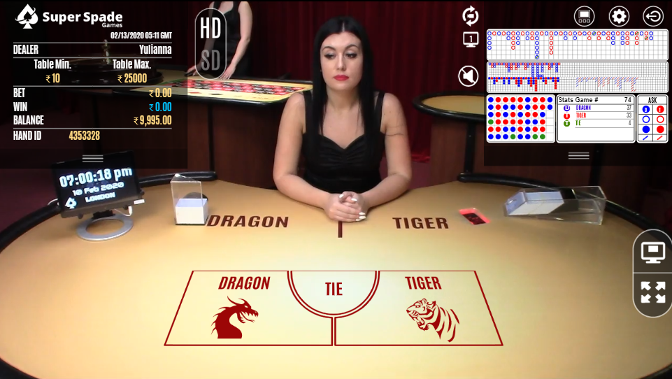 अपने सभी लाइव डीलर गेम्स की तरह, सुपर स्पेड भी एक सीधा-सादा ड्रैगन टाइगर गेम पेश करता है जिसमें सामान्य ऑड्स पर सिर्फ़ तीन दांव लगते हैं। ध्यान रहे कि मुझे वीडियो फ़ीड बहुत धीमी लगी जो अक्सर बंद हो जाती थी।