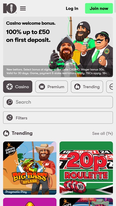 10Bet कैसीनो Microgaming, Net Entertainment, Playtech, Big Time Gaming, Evolution Gaming, iSoftBet, playson, Rabcat, Pragmatic Play, Red Tiger Gaming, Triple Edge Studios, Northern Lights Gaming, Stormcraft Studios, Switch Studios, All41 Studios, Gameburger Studios, Pulse 8 Studios, Neon Valley Studios, SpinPlay Games, GONG Gaming, Buck Stakes Entertainment, Games Global, 2by2 Gaming, Blueprint Gaming, Merkur Gaming, Inspired Gaming, Reel Time Gaming, Old Skool Studios, Foxium, Just For The Win, PearFiction Studios, Wild Streak Gaming, Slingshot Studios, Fortune Factory Studios, Crazy Tooth Studio, Alchemy Gaming, Snowborn Games, Max Win Gaming, Gold Coin Studios, Half Pixel Studios, Eurostar Studios, Aurum Signature Studios, Lucksome Gaming, Beter and Area Vegas द्वारा संचालित है, जो खिलाड़ियों को कैसीनो के वेब प्लेटफ़ॉर्म के माध्यम से सैकड़ों खेलों तक पहुँच प्रदान करता है। कैसीनो में एक मोबाइल प्लेटफ़ॉर्म भी है जो आपको अपने स्मार्टफ़ोन या टैबलेट के माध्यम से खेलने की सुविधा देता है।