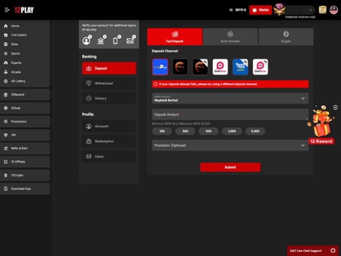12प्ले कैसीनो एक ऑनलाइन कैसीनो और स्पोर्ट्स बेटिंग वेबसाइट है जो मोंटेनेग्रो सरकार द्वारा विनियमित और लाइसेंस प्राप्त है। यह कैसीनो ई-जुआ मोंटेनेग्रो के अधिकार क्षेत्र में संचालित होता है और सिंगापुर , मलेशिया, थाईलैंड और वियतनाम के खिलाड़ियों के लिए है।