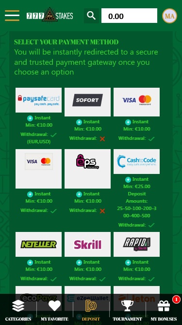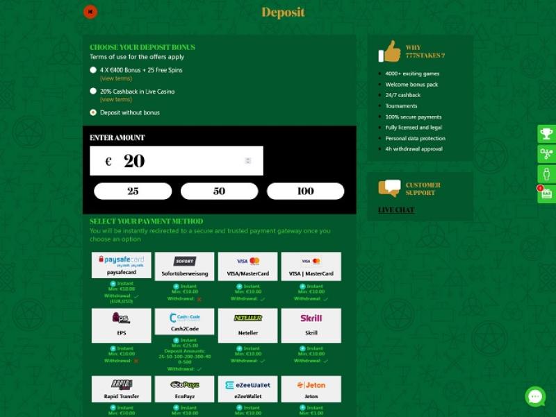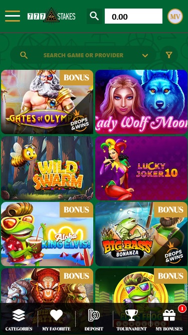 यह एक आकर्षक गेमिंग साइट है जिसमें उपयोगकर्ता के अनुकूल और नेविगेट करने में आसान कैसीनो प्लेटफ़ॉर्म है ताकि खिलाड़ी आसानी से उन खेलों को ढूंढ सकें जिन्हें वे ढूंढ रहे हैं या नए गेम ब्राउज़ कर सकते हैं। 777Stakes टेबल गेम्स, वीडियो पोकर, क्लासिक स्लॉट्स, वीडियो स्लॉट्स , जैकपॉट स्लॉट्स, आर्केड गेम्स और लाइव डीलर गेम्स प्रदान करता है।