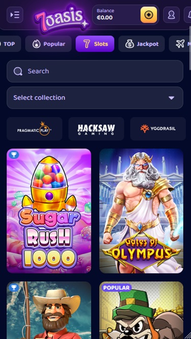 सभी उपलब्ध सामग्री को निम्नलिखित श्रेणियों में व्यवस्थित किया गया है: शीर्ष, लोकप्रिय, स्लॉट, जैकपॉट, मिनीगेम्स, टूर्नामेंट, टेबल गेम्स...